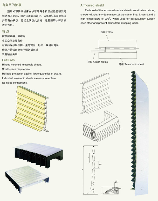 性能及用途:主要用于保護(hù)機(jī)床導(dǎo)軌面不受金屬屑、冷卻液的侵蝕,具有防屑、防冷卻液等功能,從而延長機(jī)床精度壽命。特點(diǎn):本產(chǎn)品利用耐油耐腐橡膠作為連接件并同專用鋁合金條組成,在一般情況下,無須安裝導(dǎo)向板,因此,具有體積小、外形美觀、結(jié)構(gòu)可靠性好、占用空間小等特點(diǎn),特別適用于因受空間位置限制而不能使用其它防護(hù)裝置情況下,采用此裙簾更能體現(xiàn)出其優(yōu)越性。 ![]() |