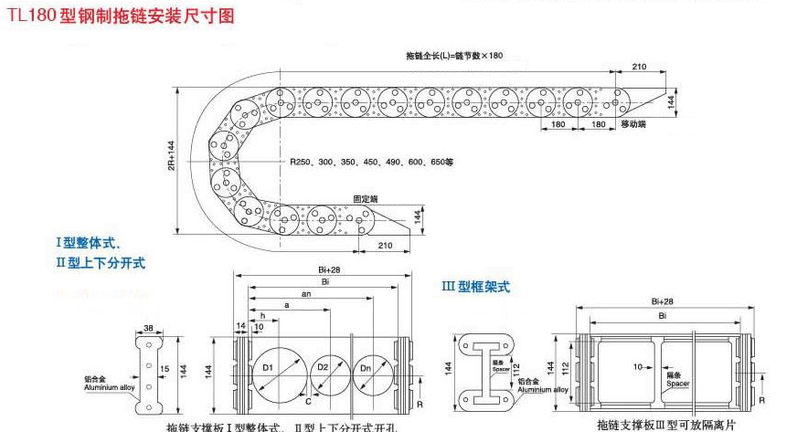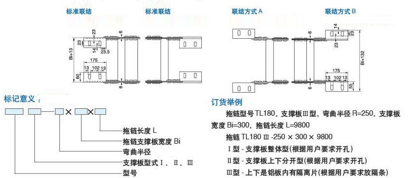 TL系列拖鏈的主體是由鏈板(優(yōu)質(zhì)鋼板鍍鉻)支撐板(擠拉鋁合金)軸銷(合金鋼)等部件組成,使電纜或橡膠管與拖鏈之間不產(chǎn)生相對運(yùn)動,不產(chǎn)生扭曲變形,鏈板經(jīng)鍍鉻處理外形效果新穎,結(jié)構(gòu)合理,靈巧強(qiáng)度高,鋼性好不變形,安裝方便,使用可靠,易拆裝,尤其是本產(chǎn)品采用了高強(qiáng)度耐磨材料,合金為軸銷,提高了產(chǎn)品的耐磨強(qiáng)度,彎曲更靈活,阻力更小,降低了噪音,從而可保證長時間不變形,不下垂。 ![]() ![]() |