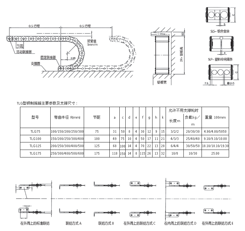 TLG型鋼制拖鏈可承載數(shù)量多,重量大的電纜及油管,自由懸置(允許不用支承輪)長度大,支撐板可依顧客需要制作,適用于工作母機,移動機械等。其彎曲半徑為50-600mm,鏈板高度為35-150mm,可任意選用。 TLG型鋼制拖鏈其使用行程最大為32米。適用于所有傳動方式。可隨意加長和縮短。此外,可通過改變銷軸獲得改變彎曲半徑。 |