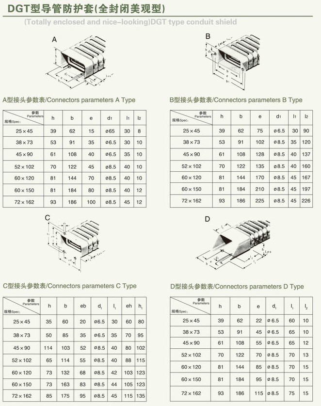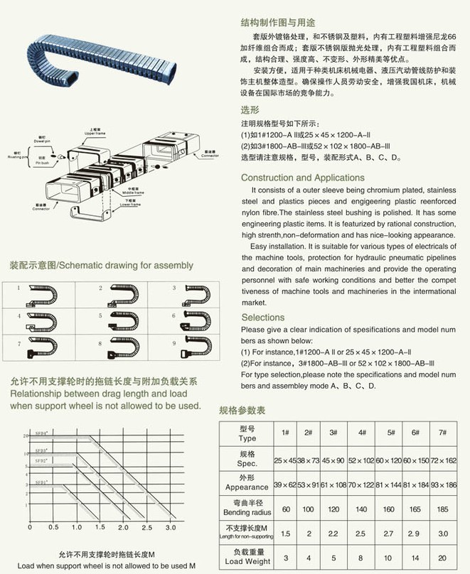 DGT型導(dǎo)管防護套,此產(chǎn)品是一種新穎的機床功能部件,它適用于數(shù)控機床、加工中心等各類機床作為電線、電纜、液、氣軟管的防護裝置,能隨機床移動部件協(xié)調(diào)地運行,可延長被保護的電線、電纜、液、氣軟管的使用壽命,降低消耗,并大大改善了機床的電線、電纜、液、氣軟管分布零亂的狀況,增強機床整體藝術(shù)造型效果,增強了我國機床在國際市場的競爭能力。 套板外經(jīng)鍍鉻處理,和不銹鋼及塑料,內(nèi)有工程塑料增強尼龍66加纖維組合而成;套板不銹鋼拋光處理,內(nèi)有工程塑料組合而成;結(jié)構(gòu)合理,強度高、不變型、外型精美等優(yōu)點。 |
